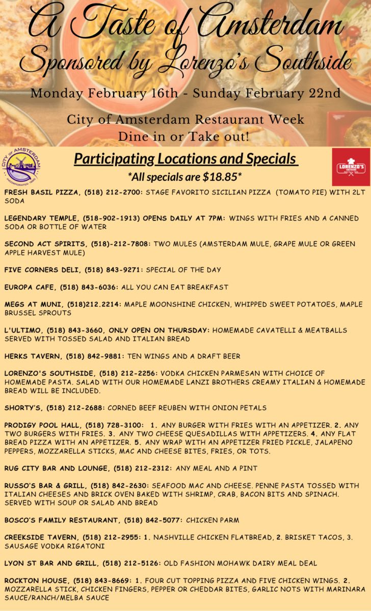 The City of Amsterdam and the Amsterdam Tourism, Marketing & Recreation Department are excited to announce A Taste of Amsterdam, Restaurant Week sponsored by Lorenzo’s Southside, returns and is better than ever.