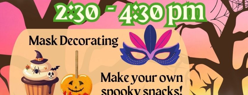 Families are invited to enjoy an afternoon of hands-on activities, including a candy apple station, cupcake decorating with eerie accents, a spooky trail mix station to customize a bag of Halloween-themed treats, and mask decorating. Costumes are welcome and encouraged. This event is free and open to all.