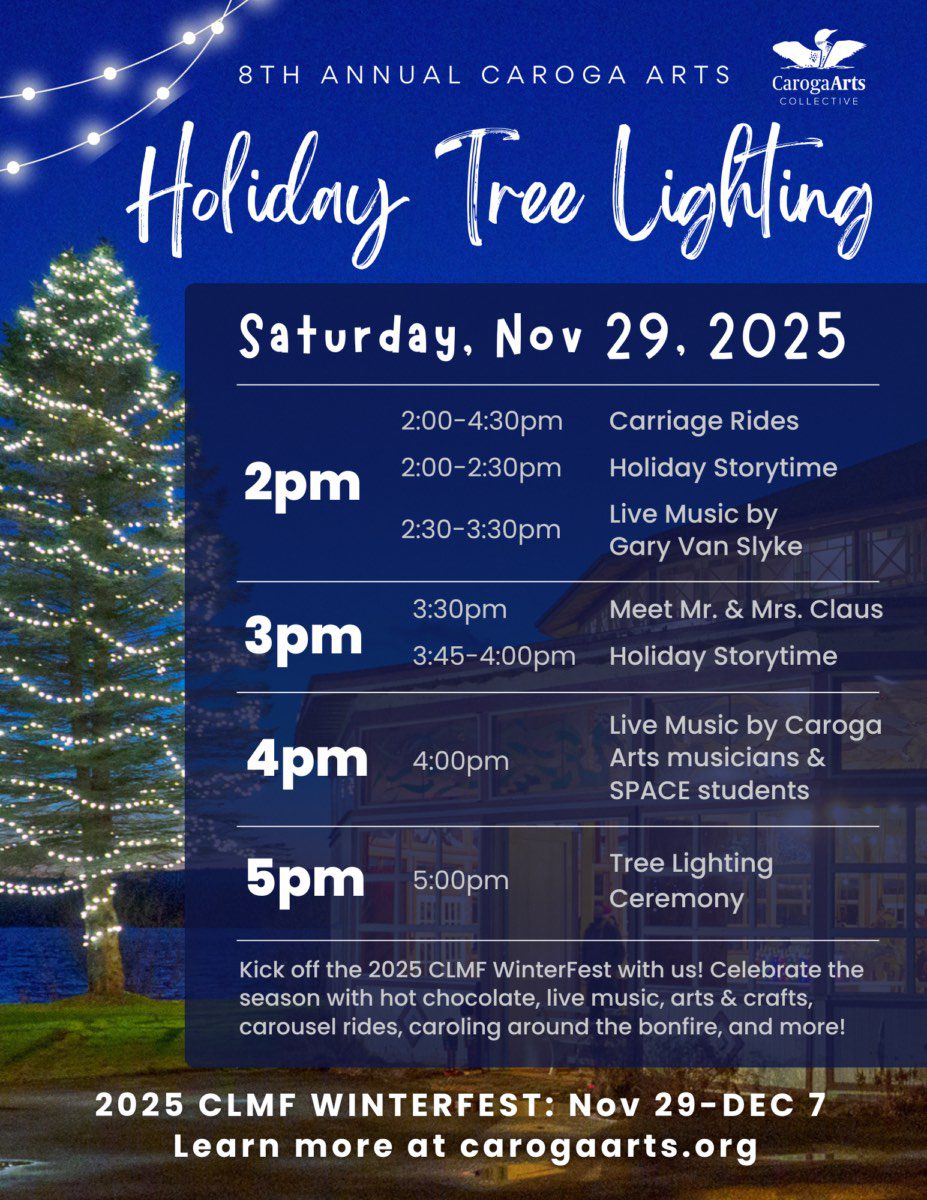 The Tree Lighting marks the official start of the 2025 Caroga Lake Music Festival (CLMF) WinterFest, running December 1-7 at venues.
