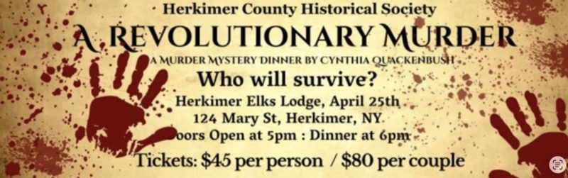 A Revolutionary Murder – A Murder Mystery will begin at 5:00 p.m. on Saturday, April 25 at the Herkimer Elks Lodge located at 124 Mary Street, Herkimer NY.