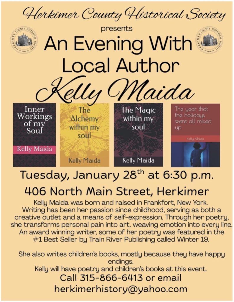 An Evening with Local Author Kelly Maida – Tuesday, January 28th at 6:30 p.m. at 406 North Main Street, Herkimer