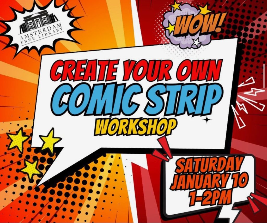Love comic strips, graphic novels, drawing, and creating stories? Come to the Amsterdam Free Library for a Create Your Own Comic Strip Workshop on Saturday January 10th from 1-2pm.
