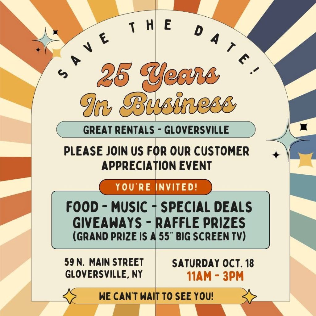 Great Rentals at 59 N. Main Street is marking 25 years in business with a Customer Appreciation Event on Saturday, October 18, from 11 a.m. to 3 p.m.