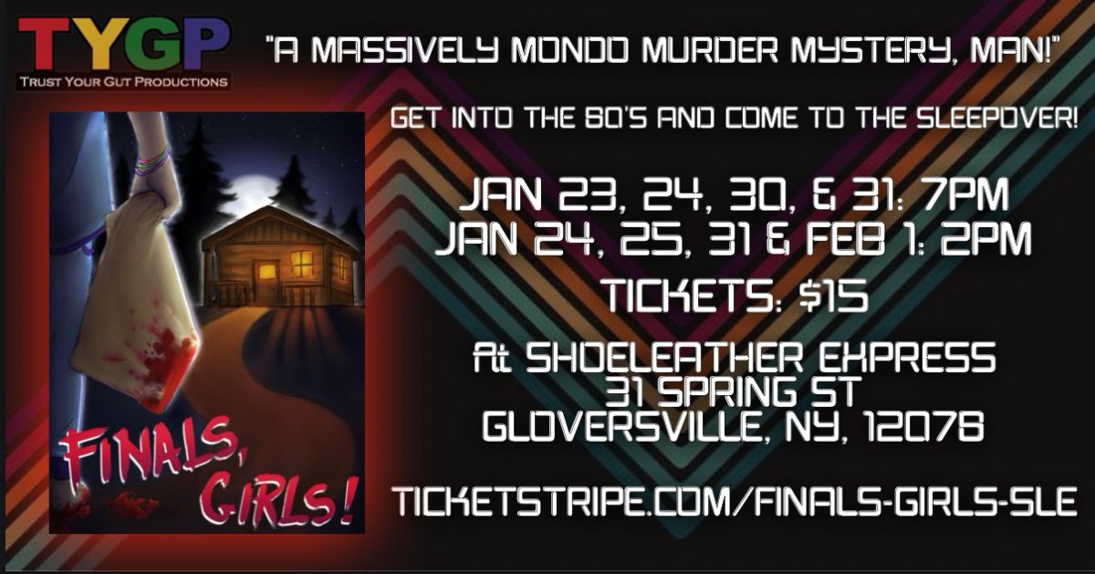 Trust Your Gut Productions’ newest murder mystery, Finals, Girls!, takes you back to the energetic eighties with this pre-teen sleepover murder mystery!