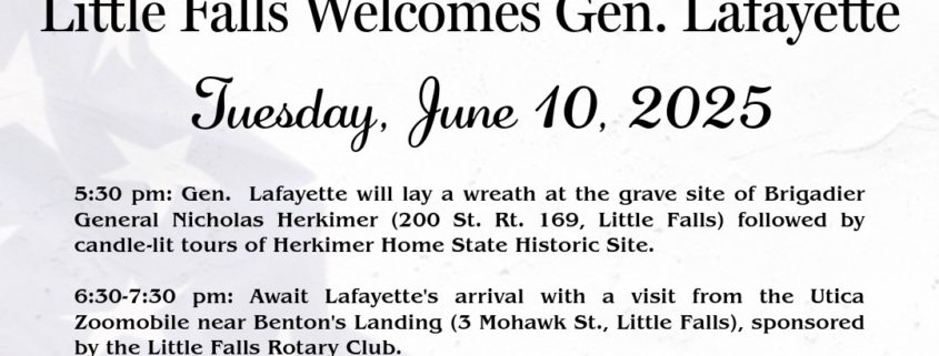 The General’s local visits will continue still; at 5:30 p.m. Lafayette will lay a wreath at the gravesite of Brigadier General Nicholas Herkimer (200 St. Rt. 169, Little Falls) followed by candle-lit tours of Herkimer Home State Historic Site.