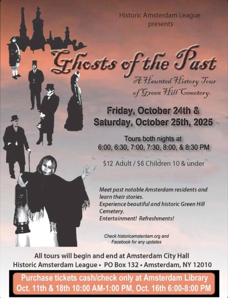 Historic Amsterdam League hosts a Ghosts of the Past haunted history tour on Friday, October 24, and on Saturday, October 25, 20025 beginning at 6:00 p.m. until 8:30 p.m. beginning at Amsterdam City Hall, Amsterdam, NY.