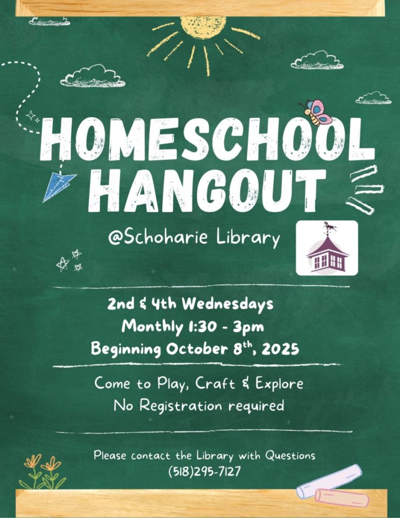 The Homeschool Hangout continues from 1:30 p.m. until 3:00 p.m. every 2nd and 4th Wednesdays of the month until May 27, 2026, at the Schoharie Library located at 103 Knower Avenue, Schoharie, NY