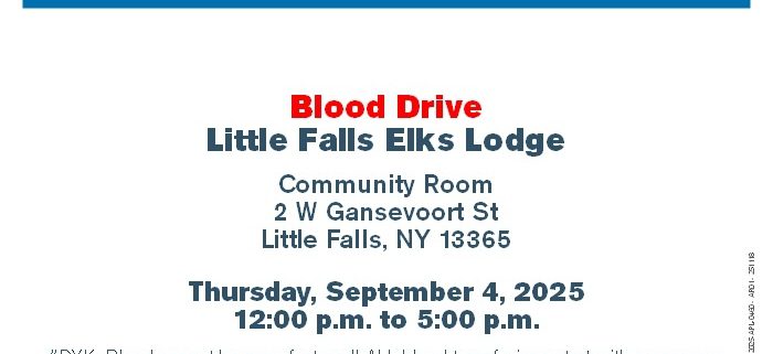 Donors can sign up by calling 1-800-RedCross or visiting https://www.redcrossblood.org/give.html/drive-results?zipSponsor=LittleFallsNY
