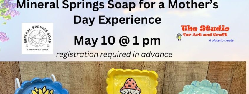 Start your adventure at Mineral Springs Soap creating your soap bar, then join us at The Studio for Art and Craft to create and glaze your clay soap dish under the supervision of our talented clay instructor.