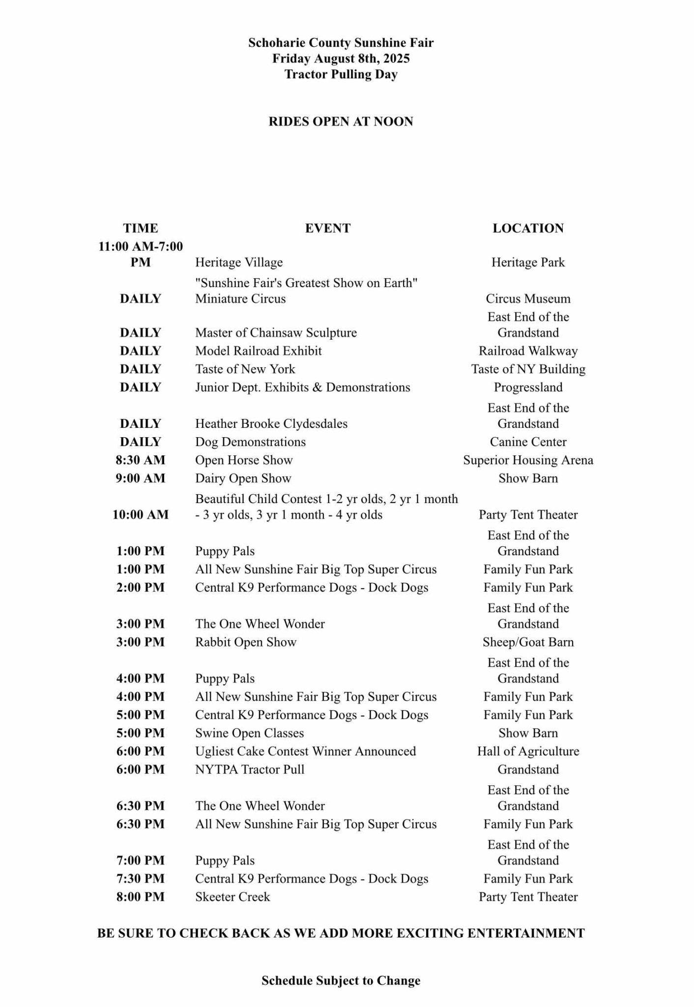 The Schoharie County Sunshine Fair begins Tuesday, August 5 and runs through Sunday, August 10, 2025 from  8:00 a.m. until 10:00 p.m. at the Cobleskill Fairgrounds located at 113 Sunshine Drive, Cobleskill, NY.