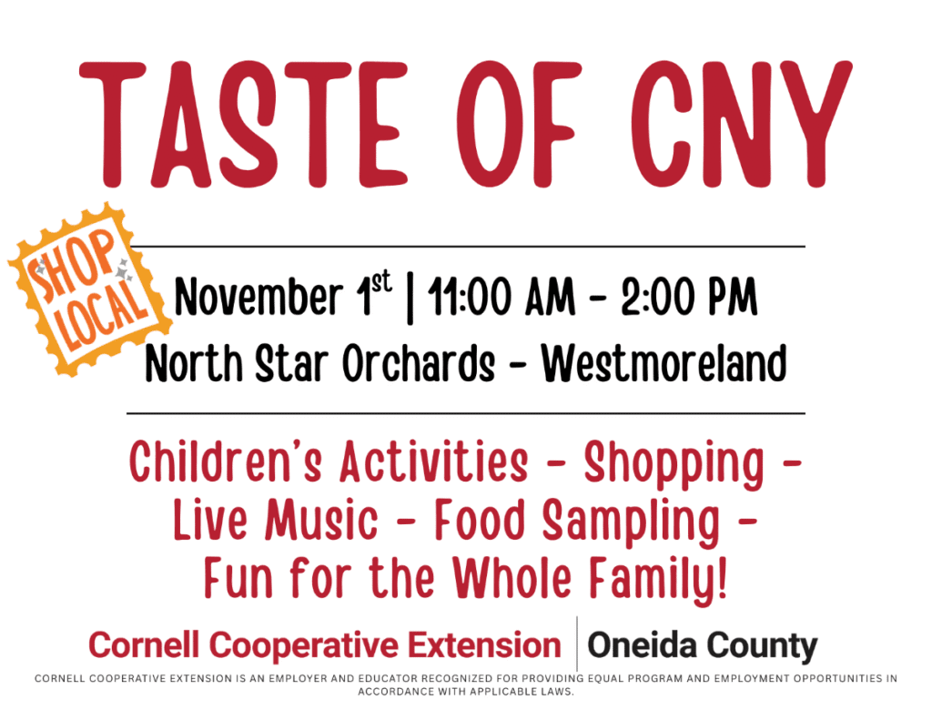 Cornell Cooperative Extension of Oneida County is hosting Taste of NY beginning at 11:00 a.m. on Saturday, November 1, 2025 at North Star Orchards located in Westmoreland, NY.