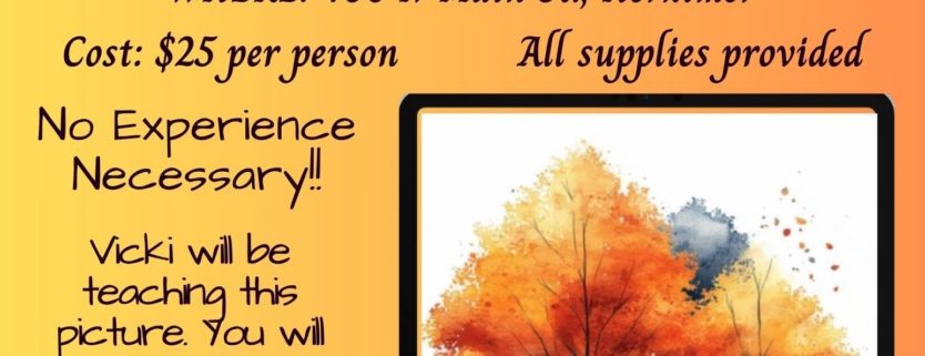 Join local artist Vicki for a cozy and creative evening as she teaches participants how to paint a stunning autumn scene. This class is perfect for beginners — all materials are provided, and Vicki will guide you step-by-step.