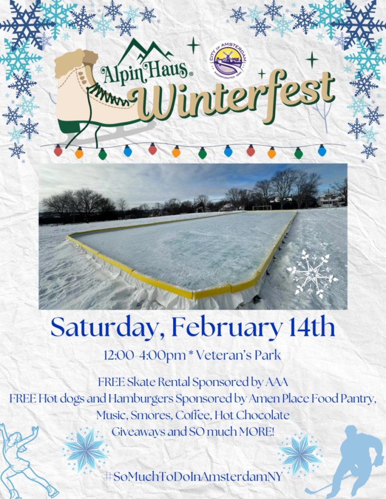 Amsterdam, NY: The City of Amsterdam and the Amsterdam Tourism, Marketing & Recreation Department presents WinterFest Sponsored by Alpin Haus on Saturday, February 14th at the Alpin Haus Ice Skating Rink located at Veterans Park in Amsterdam starting at 12pm.