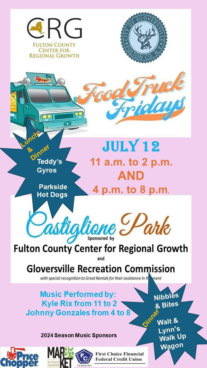 GLOVERSVILLE, NY – The 2024 Gloversville Food Truck Fridays continues Friday, July 12, with music and seating at Castiglione Park and food trucks parked on North Main Street from 11 a.m. to 2 p.m. and from 4 p.m. to 8 p.m.