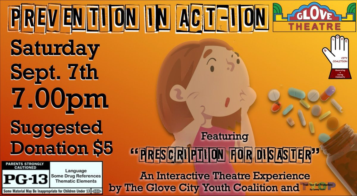 The Glove Theatre, The Glove City Coalition, and Trust Your Gut Productions are presenting a new sort of “town hall discussion” in the form of an open-ended theatre production, “Prevention in Act-ion” featuring the play, ‘Prescription for Disaster,’ from 7:00 p.m. until 9:00 p.m. at the Glove Theatre, Main Streeet Gloversville, NY.