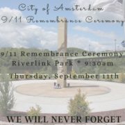 The City of Amsterdam and the Amsterdam Tourism, Marketing & Recreation Department will be hosting a 9/11 Remembrance Ceremony in Riverlink Park at the 9/11 Monument starting at 9:30am on Thursday, September 11.