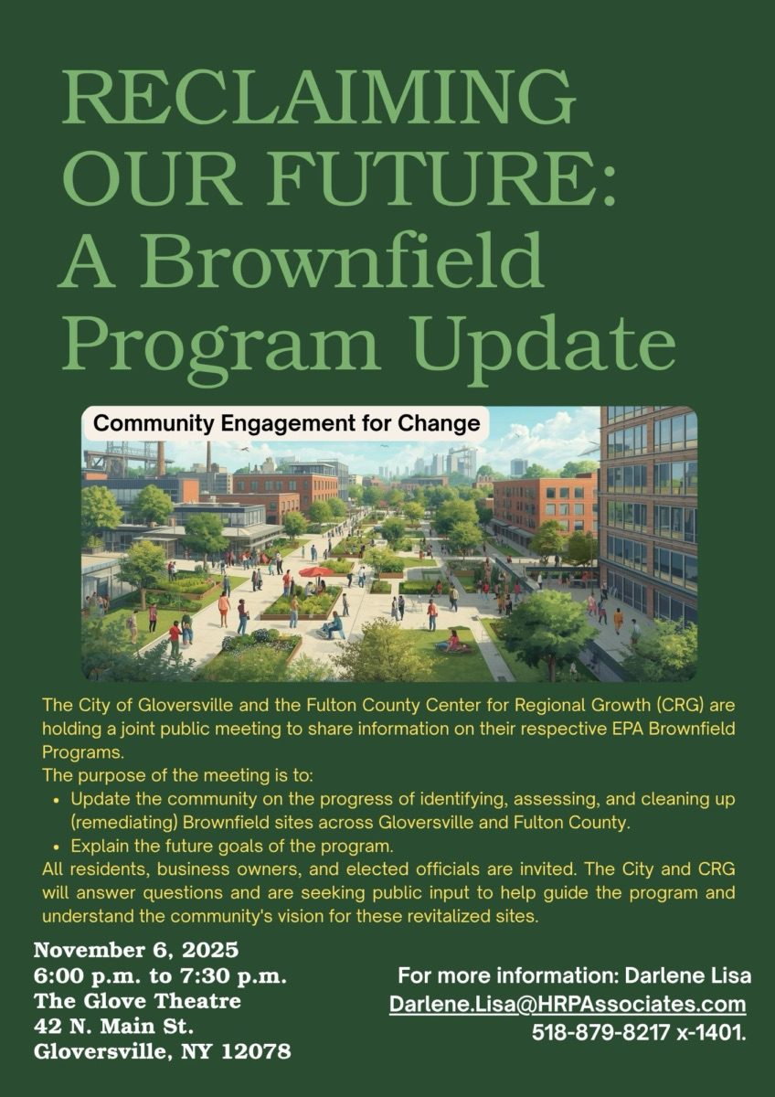 GLOVERSVILLE, NY – The residents, business owners, elected officials, and other interested community members of Gloversville and Fulton County are invited to a public town hall meeting focused on transforming underused and contaminated properties—known as brownfields—into valuable community assets. The meeting, titled “Reclaiming Our Future: A Brownfield Program Update,” will be held onThursday, November 6, 2025, from 6 p.m. to 7:30 p.m. at the historic Glove Theatre, 42 North Main St., Gloversville.